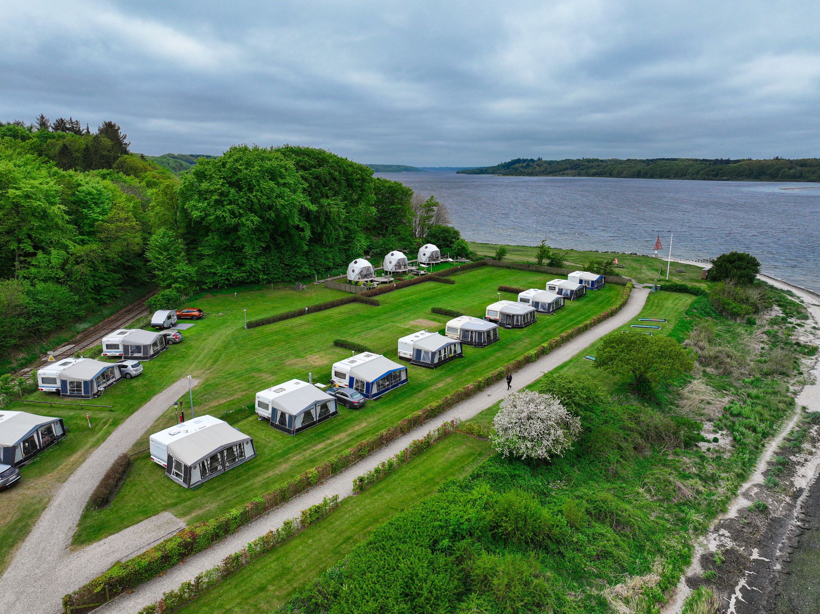På Mariager Camping kan du både bo i campingvogn, i hytter eller prøve clamping i en af fjordboblerne